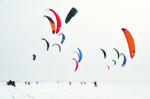 在哈尔滨国际风筝滑雪邀请赛上,多彩的风筝形成绚丽弧线迎风飞舞。本报记者 刘洋摄