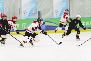 冰球比赛中,选手们积极拼抢、全力突破。本报记者 韩伟摄