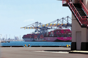 2025年4月29日在美国洛杉矶港拍摄的集装箱货轮。