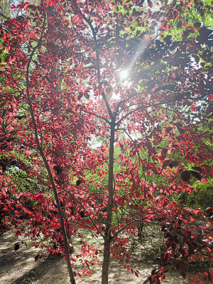 紫叶稠李以“先绿后紫、绿紫交织”的独特叶色变化,成为城市里标注红叶美景的非典型植物。之所以说是非典型,是因为紫叶稠李的树叶颜色严格地说是紫色或者紫红色,但在阳光的映射下,紫色的树叶又会呈现出明亮的红色,远远望去与枫叶的颜色很像。相比于枫树、白桦、蒙古栎等变色树种,紫叶稠李的树叶变色显得比较“着急”,它从夏天就开始变色了。进入初秋,其叶片中叶绿素完成分解,叶片全部变成紫红色。