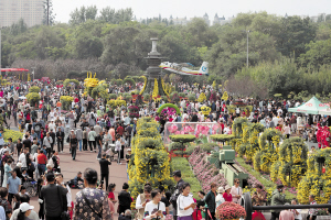 本届菊花展深度融合劳动公园地形地貌与工业文化元素,形成“菊颂华章”入口景区、鎏金菊廊·时光印记走廊、金蕊映芳·中心广场主景区及赏菊环路的“三区一环”布局。“菊颂华章”入口景区,各类菊花错落摆放,色彩鲜艳热烈,率先吸引游客目光;鎏金菊廊·时光印记走廊以时光为轴,串联老工业元素与现代花艺;金蕊映芳·中心广场主景区则成为视觉焦点,围绕标志性低压转子设置的“菊花瀑布”,搭配“双龙”造型花艺,工业硬核与自然柔美碰撞出独特火花;赏菊环路包含劳模墙、天工开物、工运史馆多个点位,游客漫步其间,沉浸式欣赏菊花之美。