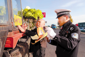 交警为菜农发放反光贴纸。 本报讯(记者 孙莹文/摄)划定秋菜便民销售点,轻微交通违法教育提示,对影响通行的售卖车辆加以引导和提示……哈尔滨市公安局交警部门推出一系列人性化执法政策,保障农民秋菜进城的安全和秩序,让秋菜购销季暖意融融。
