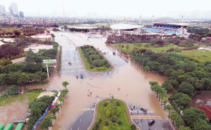 这是10月7日在越南首都河内拍摄的遭洪水侵袭的道路。