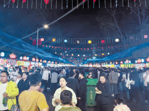 据夜市管理人员介绍,为应对假期客流高峰,市场提前增加了保洁和管理人员,确保游客在享受美食的同时,拥有安全、舒适的消费体验。此外,夜市弧形大屏幕播放具有国庆和中秋主题元素的灯光秀,让节日氛围更浓厚。