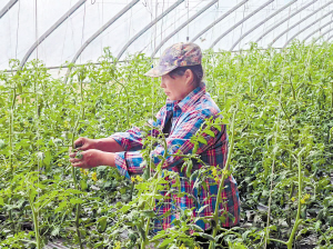 工作人员正在给西红柿打叉。 ■伊飞帆 本报记者 康福柱文/摄