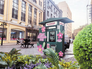 报纸拍照打卡机。 本报讯(记者 王骁文/摄)在中央大街与红星街交叉口,一台特别的打卡机前,王女士一家三口正对着镜头调整姿势。穿着红色衣服的小宝宝在“丁香花海”的主题背景前露出甜甜笑容,妈妈和姥姥轻轻揽着她,这份独特的城市记忆,在两分钟内化作一份全彩纪念报,被他们小心卷起、收好。