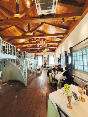 推开两层木格子门,仿佛一脚踏进百年前的欧洲田园餐厅:复古玻璃窗下用餐者小声交谈,墙上油画是一位优雅的俄罗斯女人在室外木廊眺望江面的画面,沿着景观开放式楼梯可缓步走上二楼用餐区。