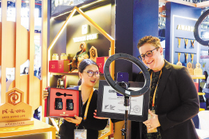 11月6日,在第八届进博会农食产品展区一家新西兰蜂蜜品牌展台,参展商在直播。新华社发 ■新华社记者 闫洁 钟雅 赵望轩