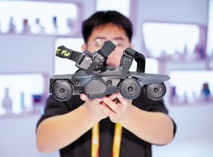 在天猫国际展位拍摄的一款轮式外骨骼机器人。这款外骨骼机器人可以套在普通鞋子上用于提升步行速度。