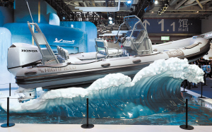 ▲11月8日在第八届进博会汽车及智慧出行展区米其林展位拍摄的使用复合涂层材料的刚性充气艇。