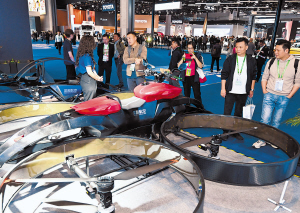 在蓝图航空展位,观众在了解一款飞行摩托。新华社发