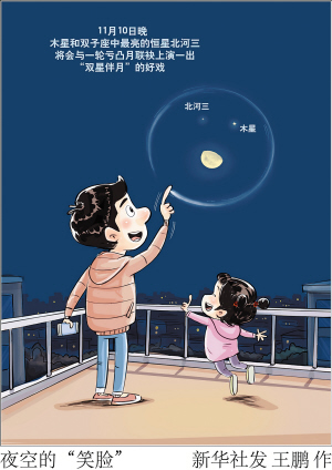 新华社天津11月8日电 当行星、恒星和月球这三个不同类型的天体“欢聚”在同一片天区,会擦出怎样的火花?机会来了。11月10日晚,木星和双子座中最亮的恒星北河三将会与一轮亏凸月联袂上演一出“双星伴月”的好戏,三者届时还会在天空中组成一张“笑脸”的样子。