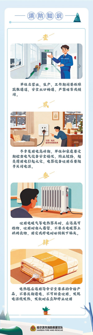 本报讯(记者 王铁军)11月是119消防宣传月,哈尔滨市消防救援支队推出系列科普宣传海报,本期内容为“驱寒取暖时莫忘消防安全”。