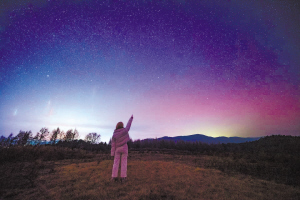 亚布力上空出现的极光。刘大鹏摄 本报讯(记者 王东)近日,受地磁暴活动影响,我省多地夜空上演绚丽极光秀,绿色、紫色的光带与地面景观交相辉映,构成一幅梦幻画卷,让市民游客大饱眼福。