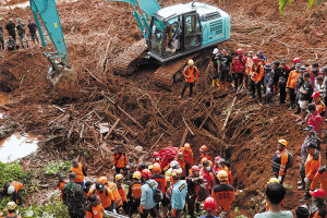 11月15日,在印度尼西亚中爪哇省芝拉扎一座村庄,救援人员在山体滑坡现场搜寻受灾人员。