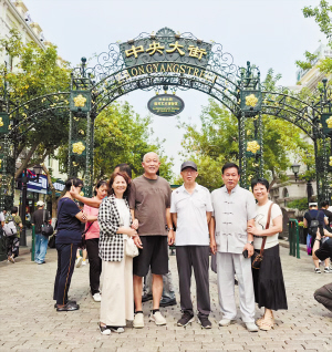 “强哥强嫂”(左一左二)邀请亲友和学生来哈游玩时的合影。