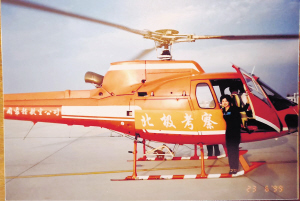 作者乘坐中国北极考察队首次采用的国产直升机——哈飞直-9。 □ 陈嘉