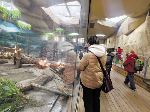 目前气温较低,双胞胎大熊猫兄弟“芝士”和“芝麻”均在内场活动,但这并没有阻挡游客的热情。内场玻璃墙前早已围得水泄不通,游客举着手机、相机,争相记录下大熊猫的可爱瞬间。