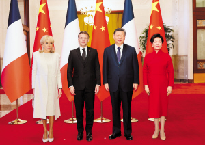 会谈前,习近平和夫人彭丽媛在人民大会堂北大厅为马克龙和夫人布丽吉特举行欢迎仪式。