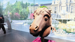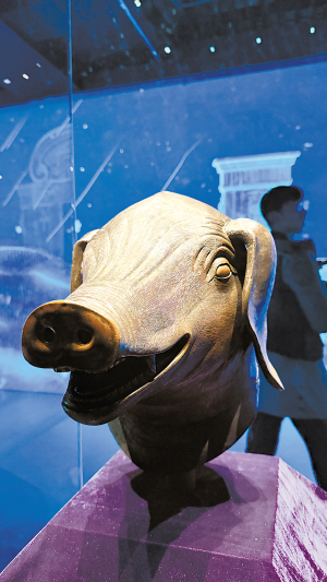 其中,核心单元“山河有声”聚焦圆明园十二生肖兽首铜像,成为全场焦点。在柔和的灯光下,牛首的厚重、虎首的威严、猴首的灵动、猪首的憨态……让观众得以近距离触摸百年风雨的印记。1860年10月,英法联军进攻北京,占据圆明园,疯狂劫掠园中大量奇珍异宝,并纵火焚烧了圆明园及其他皇家园林。在这场浩劫中,圆明园长春园西洋楼建筑群海晏堂外水力钟喷泉构件十二生肖兽首雕塑也遭到劫掠,漂泊海外长达百余年。自上世纪80年代起,流失海外的兽首铜像开始现身各大拍卖会,经过中国政府和民间的多方努力,通过回购、赠予等方式,至今已有7件兽首回归祖国。此次展览共展出7件兽首,牛首、虎首、猴首、猪首四尊兽首为珍贵文物原件,鼠首、兔首为复制件,马首为仿制件。