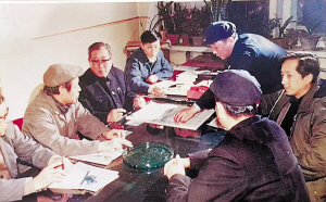 哈尔滨日报社领导及夜班编辑在讨论版面。左边靠窗第一人为作者。