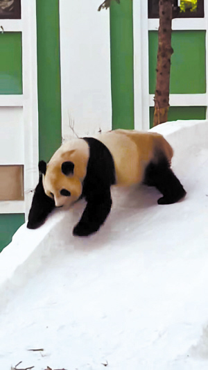 大熊猫在雪滑梯上嬉戏。 本报讯(记者 李木双)入冬后,哈尔滨的冰雪乐趣,让太阳岛大熊猫馆的双胞胎大熊猫“芝士”“芝麻”彻底爱上了哈尔滨的冬天。它们在各自的专属雪滑梯上灵活翻滚、自在滑行的模样,引得市民游客阵阵惊叹,成为冰城冬日里的一大亮点。
