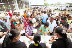 12月10日,民众在位于泰国沙缴府的一处避难所排队领取食物。