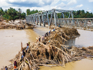 12月9日,在印度尼西亚亚齐省,居民通过修复中的桥梁过河。 新华社发 新华社雅加达12月13日电 印度尼西亚国家抗灾署13日发布的统计数据显示,该国北苏门答腊省、西苏门答腊省和亚齐省近日遭遇的洪灾和山体滑坡已造成1003人遇难、218人失踪。