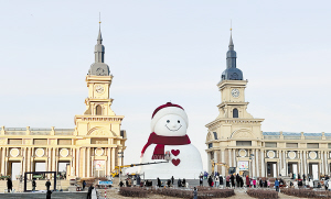 憨态可掬的大雪人。 ■本报记者 王坤文/摄