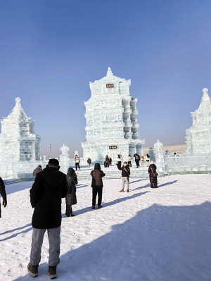 在园区的雪墙上,蓝色也格外抢眼,高大的青花瓷雪雕吸引着游客驻足。“不仅冰能雕刻出伟岸的建筑,雪居然也可以雕塑得如此完美,真是太惊艳了。”湖南游客孙女士说。
