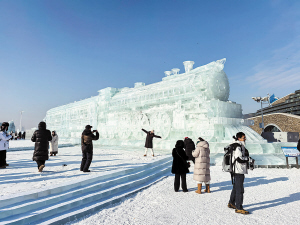 进入园区,首先看到两组火车冰雕。其中一个为“蒸汽火车”,景观全长42米、高6米,车轮与冰轨精巧衔接,让人仿佛看到列车驰骋在百年前的时光长河中。这座冰雕在冰雪天地中凝结成一部无声的历史长卷,既显现了哈尔滨城市文化的深厚底蕴,也铭刻着城市发展的初心记忆。