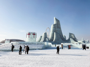 行过冰雕列车,便可看到本届冰雪大世界的主塔——冰灯启梦。白天来冰雪大世界,它显得格外耀眼,在晶莹剔透的冰雪世界里,只有它的附属建筑上挂着红色的中国结。“在这里跨年,一定很美。”一位来自南方的游客说。