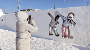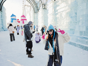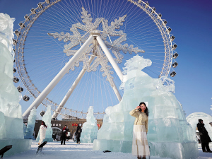 在“冰马逐梦”冰雕群里,与冰雕骏马亲密接触,遥望雪花摩天轮。