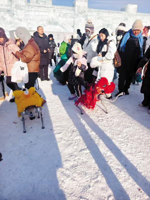 机器狗与游客热情互动。 本报讯(记者 李木双 文/摄)哈尔滨冰雪大世界开园首日惊喜连连,刚入园的游客便被两只特殊的“迎宾员”吸引目光,瞬间成为现场焦点——装扮成醒狮模样的遥控机器狗灵动可爱,不仅颜值吸睛,还能与游客亲切握手、合影留念,科技感与趣味性十足,让人们入园体验充满新鲜感。现场还有机器人与游客拍照互动。