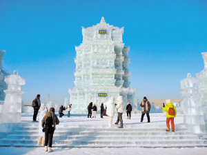 白日里,冰雕黄鹤楼晶莹剔透;夜幕降临,冰楼流光溢彩、如梦似幻,仿佛将游客带入“诗仙执笔、鹤影掠空”的千古意境。设计者巧妙融入诗歌元素,让冰冷的冰建筑浸润了文化温度,千年诗情与现代创意在此交相辉映。
