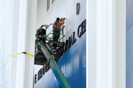 12月19日,工人在美国首都华盛顿为肯尼迪中心更名。 美国白宫新闻秘书莱维特18日说,位于美国首都华盛顿的知名表演艺术场所肯尼迪中心已更名为“特朗普-肯尼迪中心”。此举遭美国民主党和肯尼迪家族强烈反对。 新华社发