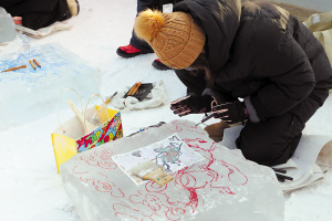 制作冰雪画。 本报讯(刘喆 兴宇 记者 韩伟文/摄)12月21日,伏尔加庄园迎冬节暨拓彩冰雪画创研展示秀活动在伏尔加庄园雪姑娘童话城堡前盛装启幕。人们跳起奔放的迎冬舞,欢庆冬日和“雪姑娘”的到来,充满俄罗斯风情的歌舞、热情欢快的非洲舞及各类冰上运动表演精彩纷呈。来自国内外的游客参与其中,尽情感受龙江冰雪文化的无穷魅力。