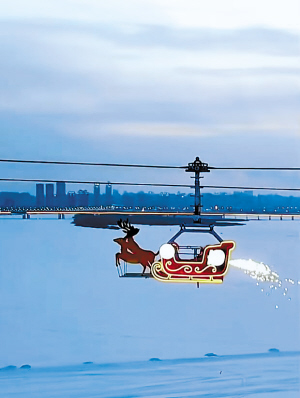 江上城堡观光索道的主题轿厢。 本报讯(记者 于博洋文/摄)近日,冬天的松花江畔增添了一处梦幻童话打卡地。江上城堡观光索道推出“飞天驯鹿”主题轿厢,以浓郁的奇幻色彩,一跃成为哈尔滨冰雪季的新晋热门体验项目,吸引众多游客慕名而来。