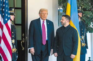 10月17日,在美国首都华盛顿白宫,美国总统特朗普(左二)欢迎乌克兰总统泽连斯基(左三)。新华社发