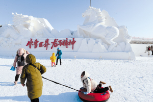 以马为主题的雪雕作品。本报记者 刘洋摄 本报讯(记者 王丹 李木双)明年是农历马年,哈尔滨冰雪大世界匠心打造“万马奔腾”主题冰雪景观群,将“马”元素与精湛的冰雪雕刻技艺深度融合,为市民游客献上一场兼具视觉震撼与文化底蕴的冬日盛宴。