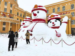 游客和雪人合影。本报记者 刘洋摄 本报讯(记者 尹明)日前,哈尔滨市总工会以冰雪为媒,在哈尔滨市职工服务中心门前精心打造了一组大型职工主题雪人群像。3座憨态可掬又气势昂扬的雪人悄然矗立,迅速成为冰城冬季又一标志性景观,吸引众多市民游客驻足合影。