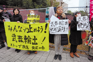 在集会现场,抗议者手举写有“不要出售‘日本制造’的武器”“不要战争”“坚决反对武器出口”等字样的牌子,要求执政联盟停止旨在放宽武器出口限制的一切努力。