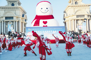 精彩的秧歌展演。 本报讯(记者 于秋莹文/摄)12月27日,在群力音乐公园广场大雪人景观前,由黑龙江省文化和旅游厅主办,哈尔滨市文化广电和旅游局、省图书馆、市群艺馆承办,哈尔滨市群众艺术馆实施的黑龙江省2025年“冰天雪地 美好生活”系列群众文化惠民活动启动仪式暨“雪舞龙江”全省秧歌舞展演火热开演。来自全省13个地市的27支秧歌队伍、近1200名演职人员以一场充满东北风情的民俗盛宴,为冰雪旅游再添一把“燃情之火”。