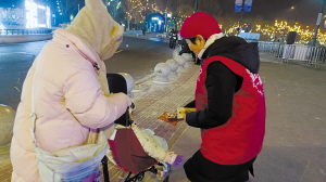 志愿者为游客免费发放热贴。 本报讯(记者 霍亮文/摄)“免费送您一个热贴,暖暖手!”12月28日,在哈尔滨冰雪大世界入口处,志愿者为往来游客免费发放热贴。这份来自冰城的贴心暖意,让游客在观赏冰雪奇观时,从掌心暖到心里。