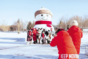 市民游客正在“雪熊”前打卡拍照。 本报讯(记者 康福柱文/摄)“家门口就有雪雕了,咱们的城市越来越漂亮了!”12月30日,在阿城区金都大桥附近的小广场,不少市民游客正在“雪熊”前打卡拍照,大家对越来越漂亮的城市赞不绝口。今冬,阿城区在广场、高速路出入口等公共场所建起多座大型雪雕、冰雕作品,将冰雪艺术融入城市景观,为市民提供沉浸式游玩体验,提升城市魅力。
