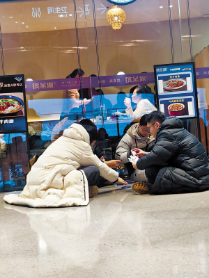 当天美食馆内游客络绎不绝,不少人直接席地而坐,享受这难得的休憩时光。一些游客三五成群围坐在一起,分享着手中的美食,交流着逛园的所见所感。有人拿出随身携带的扑克牌,几人一组玩得不亦乐乎。也有不少游客因旅途奔波略显疲惫,直接趴在旁边的凳子上,渐渐进入梦乡。