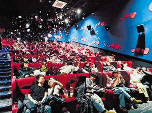 影厅内下起“花瓣雨”。 本报讯(记者 高云文/摄)“新年快乐!”影厅内下起“花瓣雨”,观众在影院里“花样”跨年……万达影城用光影与浪漫定格令人难忘的跨年时刻。