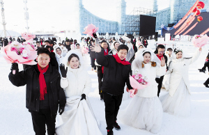 新人在哈尔滨冰雪大世界合影留念。本报记者 刘洋摄 本报讯(记者 阴祖峰)1月6日,以“纯洁冰雪,唯美爱情”为主题的第四十二届“四季沐歌”公益冰雪集体婚礼在哈尔滨冰雪大世界举行,来自全国18个省、自治区、直辖市的42对新人,身着礼服与婚纱,在冰雪雕琢的天地间携手许下誓言,开启人生新程。