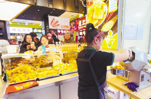 新出锅的锅巴备受市民游客青睐。 ■本报记者 毕博文/摄