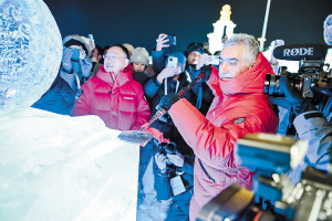嘉宾们拿起冰铲,体验冰雕制作的乐趣。